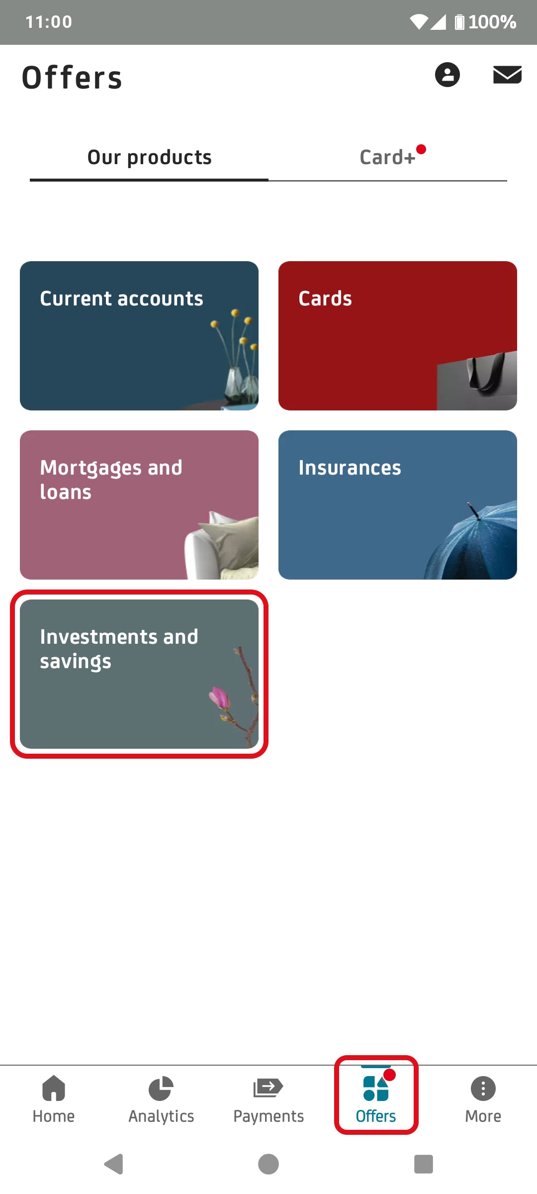 Log in to mBanking service in the UniCredit’s mBanking mobile application, then tap on the Securities account opening section of the Investment product at the bottom of the landing page, which will redirect you to launch the securities account opening process, or choose one of the securities types on the Investments and savings tile under the Offers menu item on the home screen.
