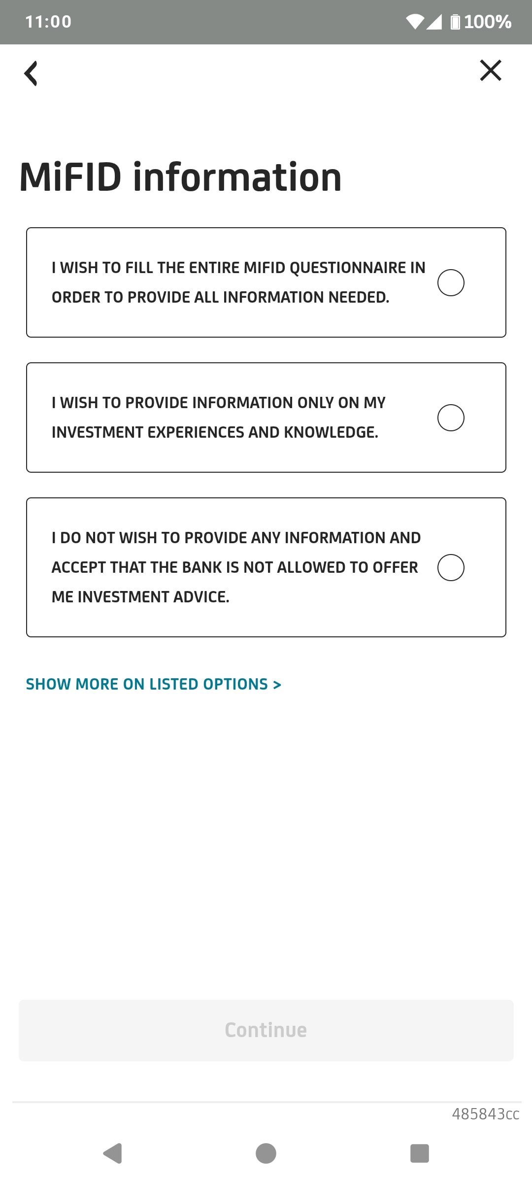 If you choose, I do not wish to provide any information and, at the same time acknowledge that, in the absence of information the Bank is not be allowed to offer me investment consultancy services and will not be able to review the appropriateness of financial instruments.