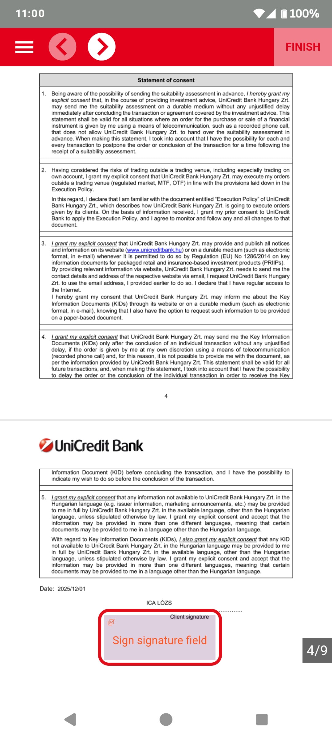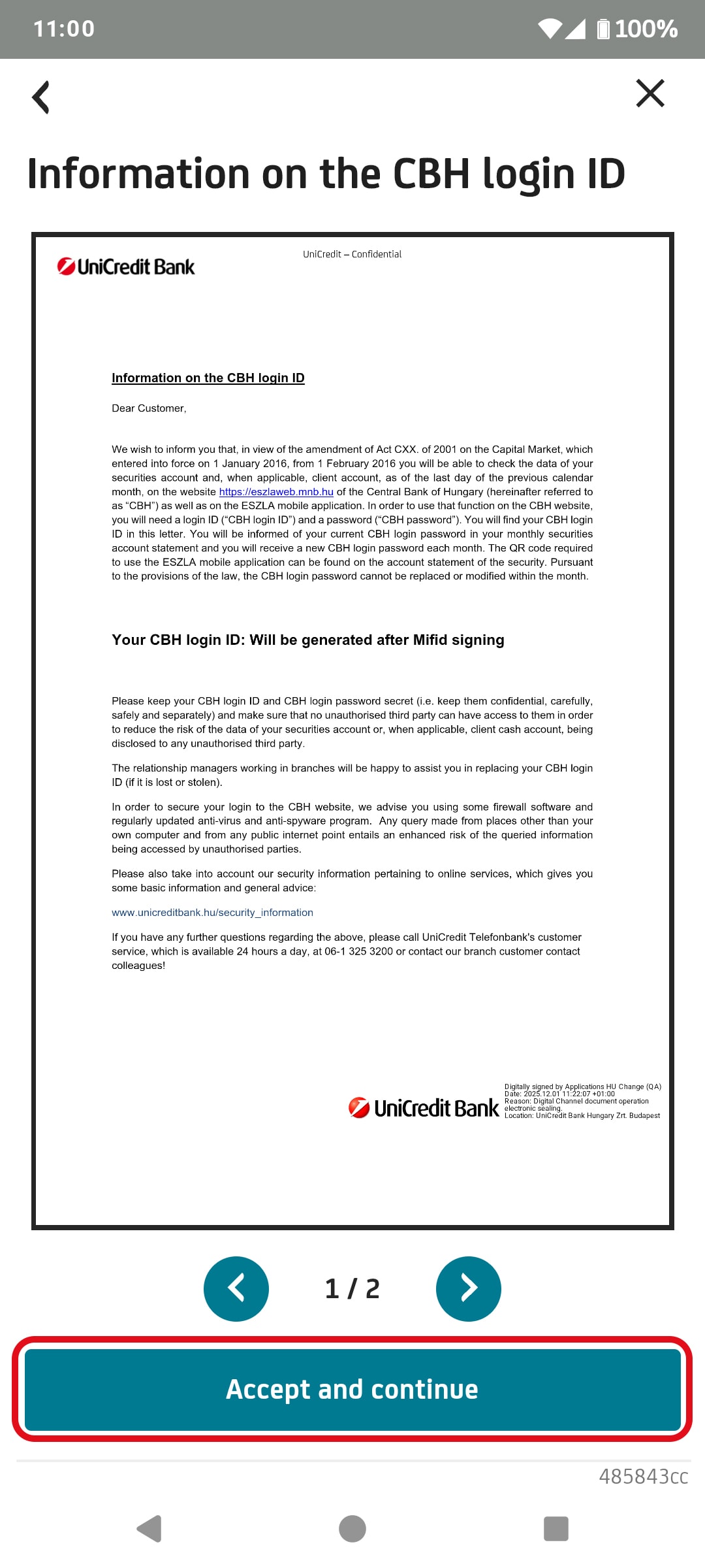 A valid Hungarian mobile phone number is required for electronic signatures; you can check the phone number registered in the system at the start of the process and change it, if necessary. You will need to sign in 2 locations during the process. The first is the assessment after you complete the MiFID questionaire, the second is the document containing the answers you gave to the questions. In this section, the “Accept and continue” button becomes active after you have viewed all pages of the document to be signed. Pressing it allows you to sign these documents together, after which we will send you a one-time code in a text message. You will have to enter this code and the PIN code you use to log in to mBanking or use biometric identification to finalise your signatures on the documents.