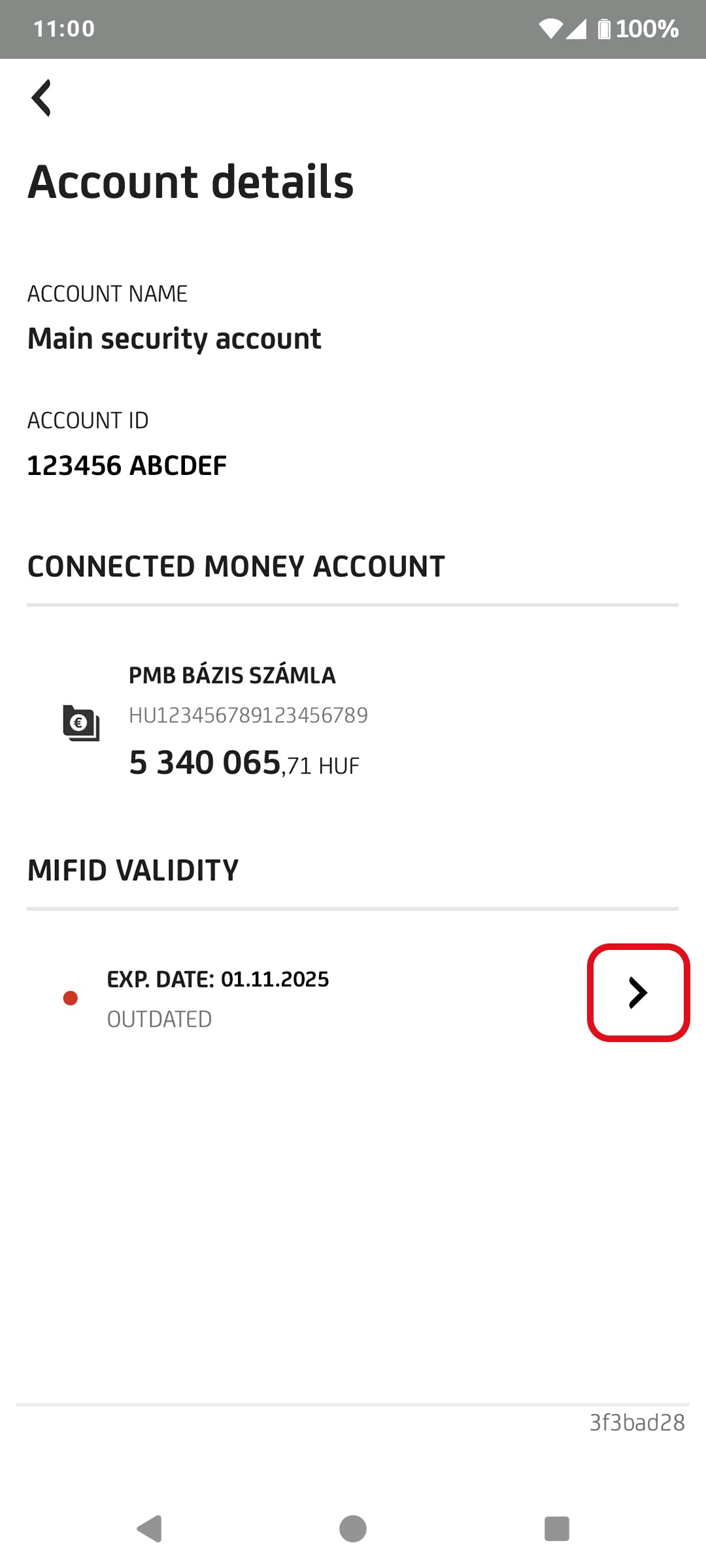 tap on the “Investment” module on the bottom of the mBanking home screen > choose the “Account list” tab in the top row > choose “Main security account” from the list of accounts > tap on Account information > tap on the arrow next to the expiry date of the MiFID validity at the bottom of the Account information page.