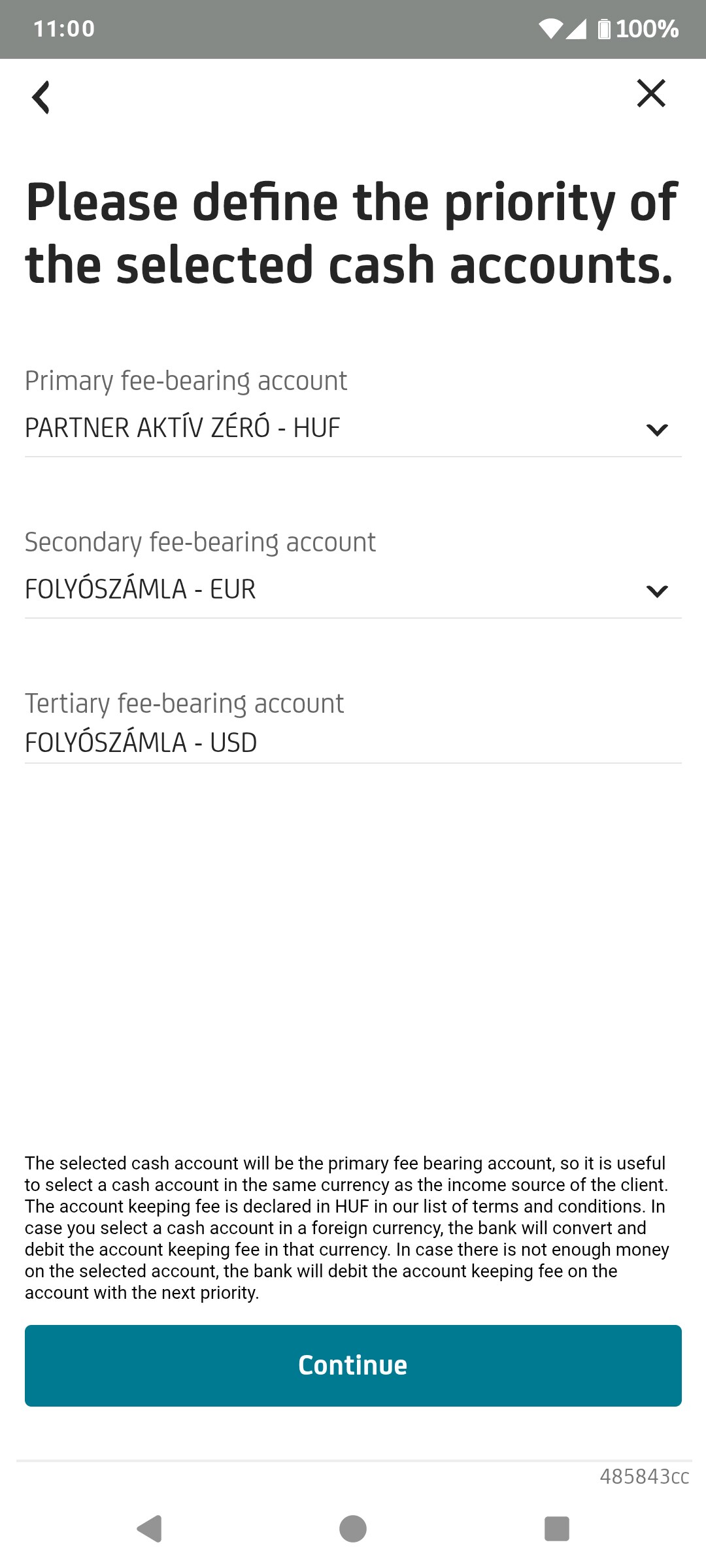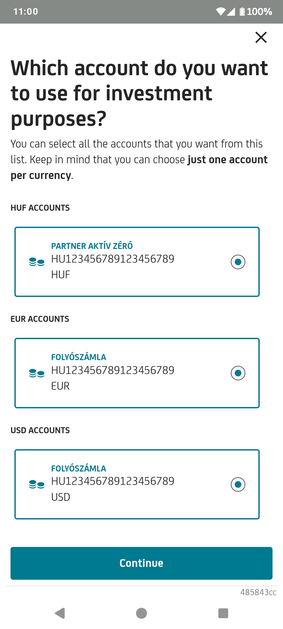 The current accounts (HUF, EUR, USD) listed in the mBanking service are selectable (one account per currency) to be linked to the securities account. The system will then be able to fulfil securities orders from these accounts. Of the selected current accounts, select the one that will be the primary debit account - you should choose an account with the same currency as your source of income. The custody fee will be determined in HUF in the applicable list of conditions. If you choose a current account kept in another currency the bank will exchange the custody fee and charge the account in the given currency. If the funds on the selected account are insufficient, the Bank will charge the custody fee to the next account with priority.