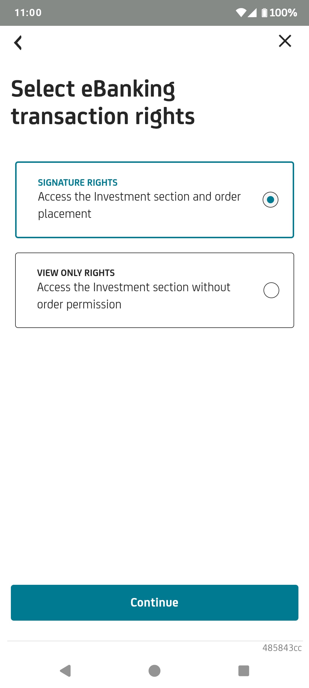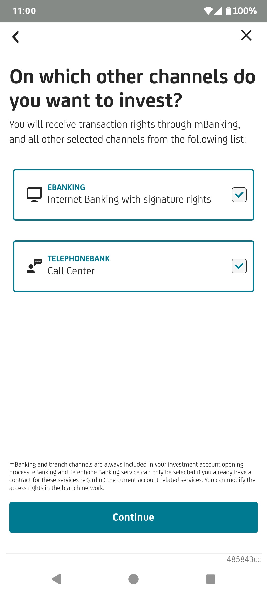 The mBanking Investment module with signature rights and the option for in-branch administration are linked to opening a securities account online. The eBanking and Phone Banking options are available only if you have signed a contract for these services pertaining to the linked current accounts. If necessary, you can change the rights you have set in our nationwide network of branches. You can link a securities account to the eBanking or Phone Banking channel, if you have the signature rights (the right to place orders) or the view only rights (without the right to place orders).