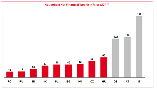 In fact, not only bank loans but also debt securities account for a much lower proportion of companies debt financing for CESEE companies, compared to Western European industrialized countries; the net financial wealth of private households in CEE is still below those of households in Germany, Italy and Austria, and they are invested in comparatively basic products. Wealth growth will create scope for greater demand for wealth management services going forward.