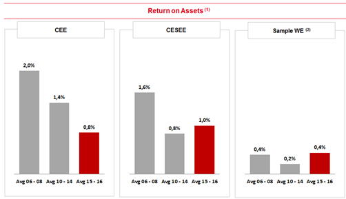 CEE banks are still more profitable than those in Western Europe, but their earnings power is noticeably levelling off at a more sustainable level. While their return on assets in the boom years before the crisis (2006 to 2008) stood at an average of 2 percent, between 2010 and 2014 it amounted to 1.4 percent. In 2015 and 2016, influenced by the situation in Russia, it should reach 0.8 percent. According to analysis by UniCredit experts, the return on assets for credit institutions in Central and South-Eastern Europe (CESEE2) in the above mentioned three periods is 1.6, 0.8 and 1.0 percent, respectively. Banks in Germany, Italy and Austria, by contrast, produce figures of 0.4, 0.2 and 0.4 percent.