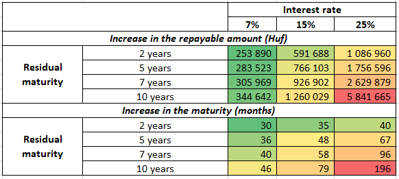 Interests and fees not paid during the moratorium period are not capitalised and do not accrue interest either during the moratorium or at the end of the moratorium, and must be paid in equal instalments with the remaining repayment instalments due over the remaining term. As a result, the total term of the loan increases, the maturity of the loan is extended by a higher extent than the period under the moratorium, and thus the total amount payable over the entire term also increases.