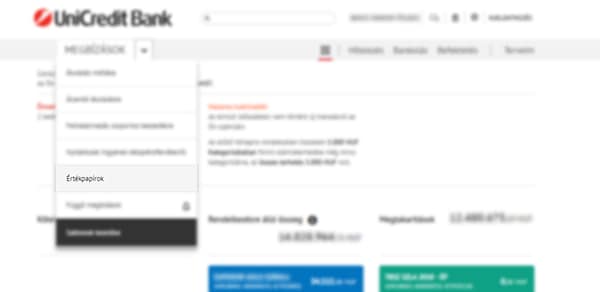 • Az [UniCredit eBanking] rendszerbe történő belépést követően az UniCredit logó alatt található Megbízások legördülő menüből válassza ki az Értékpapírok menüpontot.