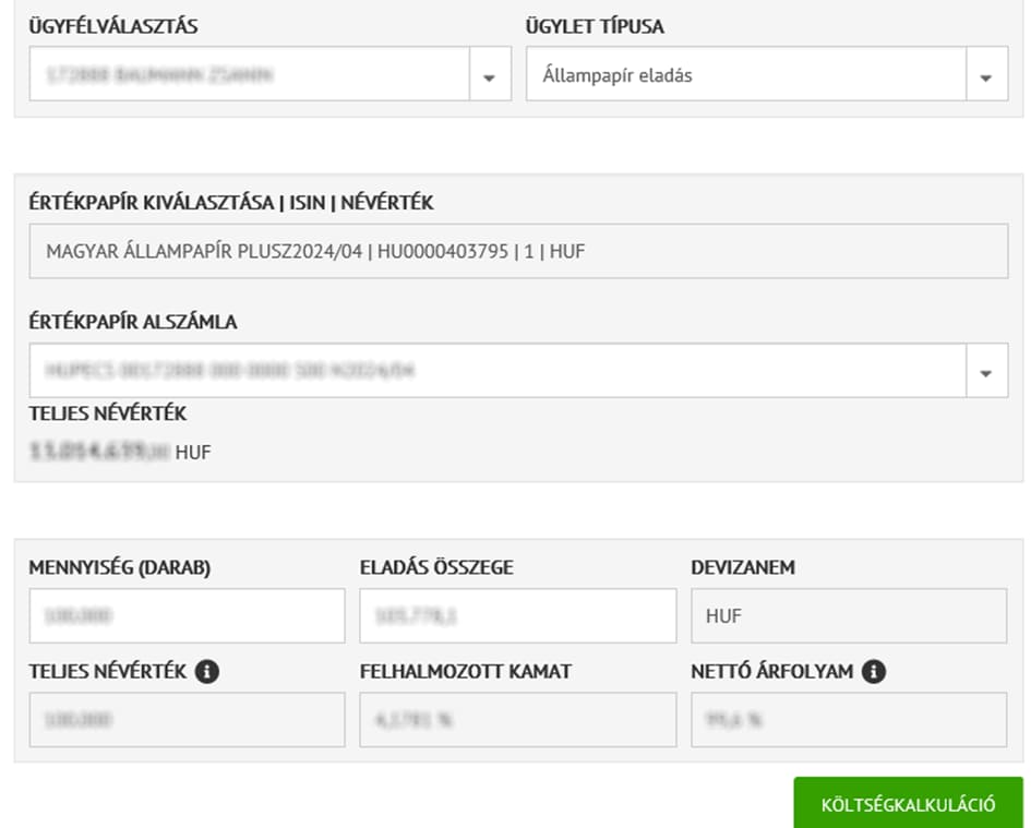 Először az „Értékpapír alszámlát” kell kiválasztani, ahol már az állampapír rövid nevét is kiválasztja egyúttal, majd az „Értékpapír kiválasztása” mező automatikusan töltődik az állampapír nevével és ISIN- kódjával, ill. megmutatja a rendszer a „Teljes névértéket”. Ezt követően adhatja meg az eladni szánt „Mennyiséget (darab)”, a rendszer pedig a napi árfolyam alapján kalkulálja az „Eladás összegét”.