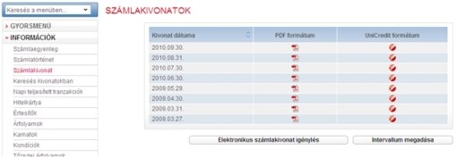 Ebben a menüpontban egy adott időszakra vonatkozó, adott napon készült számlakivonatok lekérésére, illetve azokban történő keresésre van lehetőség. Itt, az „Elektronikus számlakivonat igénylése” gomb segítségével, illetve a Megbízások menü Elektronikus számlakivonatok pontban nyilatkozhat arról, hogy az UniCredit Bank Hungary Zrt-nél vezetett bankszámláiról elektronikus bankszámlakivonatot kérjen SpectraNet Internet Banking rendszerünkön keresztül.