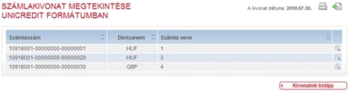 A Számlakivonatok listájában bármikor megtekintheti az előállítás ideje szerint sorba rendezett folyószámla kivonatait. A dátum mellett szereplő formátumok segítségével eldöntheti, hogy UniCredit (internetes verzió), vagy PDF (postai kivonatoknak megfelelő) formátumban kívánja-e megtekinteni kivonatait.