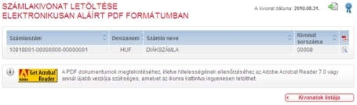 A kivonatot különböző formátumokban tudja nyomtatni illetve exportálni. Ha valamelyik számla kiválasztásra került, akkor csak annak a számlának a kivonata kerül nyomtatásra illetve exportálásra. Ha egyik számla se lett kiválasztva, akkor az adott dátumon belüli összes számla adata nyomtatásra illetve exportálásra kerül. A tranzakció részleteinek megnézésénél lehetőség van az egyes tranzakciók nyomtatására külön-külön is. „ PDF formátum” választásakor a kiválasztott kivonatok PDF formátumban állnak az Ön rendelkezésére, a postai úton kiküldött kivonattal megegyező formában. Lehetősége van arra is, hogy a „Hitelesített kivonat letöltése” gomb megnyomásával elektronikusan aláírt, időbélyegzővel ellátott kivonatot tölthessen le.
