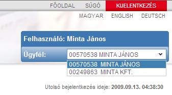 A SpectraNet Internet Banking rendszer használata esetén a bejelentkezett felhasználó neve alatt megtalálja az aktuálisan használt ügyfél (számlatulajdonos) nevét. Ha Ön egyszerre több ügyfél adatait is kezelheti, akkor ebben a lenyíló mezőben több ügyfél neve is megjelenik.