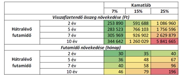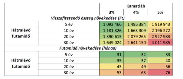 Egy 2020. március és 2022. június között tartó fizetési moratórium hatása a teljes visszafizetendő összegre és a futamidőre egy 15 millió forintos lakáshitel esetében
